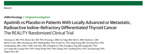 2021年12月16日,权威医学杂志《JAMA Oncology》(影响因子31.777)在线发表阿帕替尼的一项III期临床研究(REALITY)——甲磺酸阿帕替尼片治疗局部进展/转移性放射性碘难治性分化型甲状腺癌(RAIR-DTC)患者的多中心、随机、双盲、安慰剂对照临床研究。此研究由北京协和医院的林岩松教授和南京金陵医院的秦叔逵教授发起,在全国21个研究中心展开,由尊龙凯时Ag医药中央医学事务部团队支持完成。